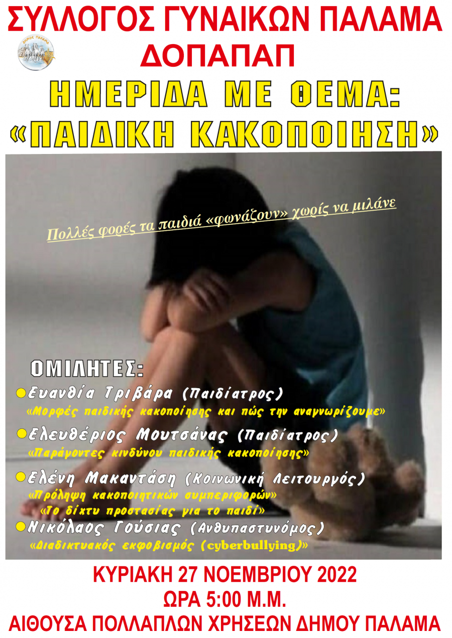 Ημερίδα με Θέμα: "ΠΑΙΔΙΚΗ ΚΑΚΟΠΟΙΗΣΗ" την Κυριακή 27 Νοεμβρίου 2022, ώρα 5:00μμ στην Αίθουσα Πολλαπλών Χρήσεων Δήμου Παλαμά.